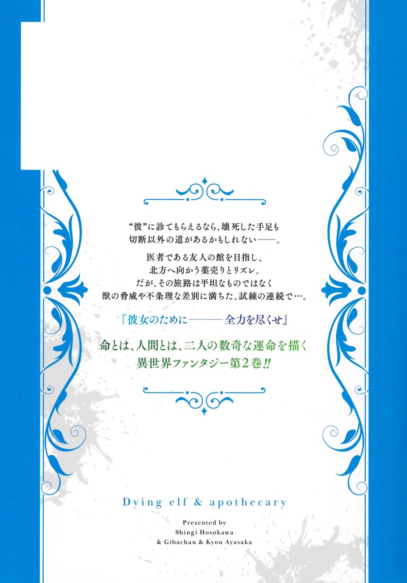 “彼”に診てもらえるなら、壊死した手足も切断以外の道があるかもしれない──。医者である友人の館を目指し、北方へ向かう薬売りとリズレ。だが、その旅路は平坦なものではなく獣の脅威や不条理な差別に満ちた、試練の連続で…。『彼女のために──全力を尽くせ』命とは、人間とは、二人の数奇な運命を描く異世界ファンタジー第2巻!!