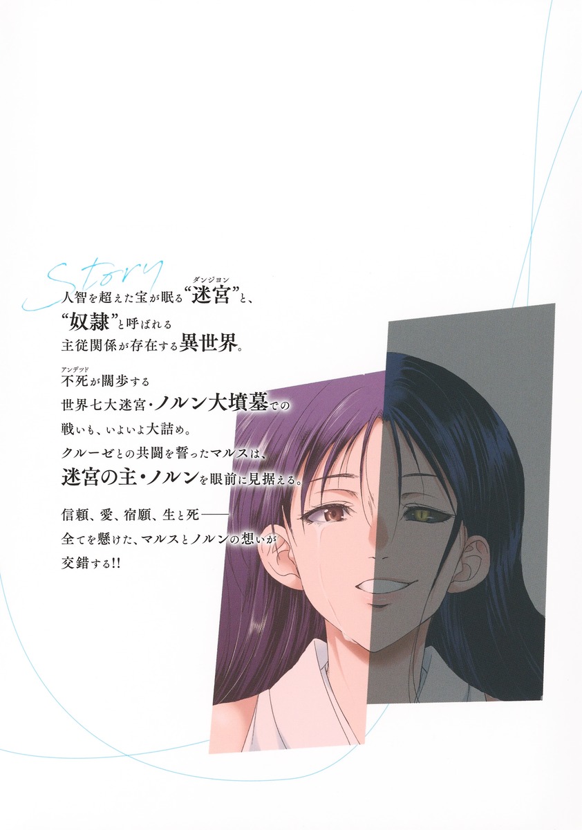 人智を超えた宝が眠る“迷宮”と、“奴隷”と呼ばれる主従関係が存在する異世界。不死が闊歩する世界七大迷宮・ノルン大墳墓での戦いも、いよいよ大詰め。クルーゼとの共闘を誓ったマルスは、迷宮の主・ノルンを眼前に見据える。信頼、愛、宿願、生と死──全てを懸けた、マルスとノルンの想いが交錯する!!