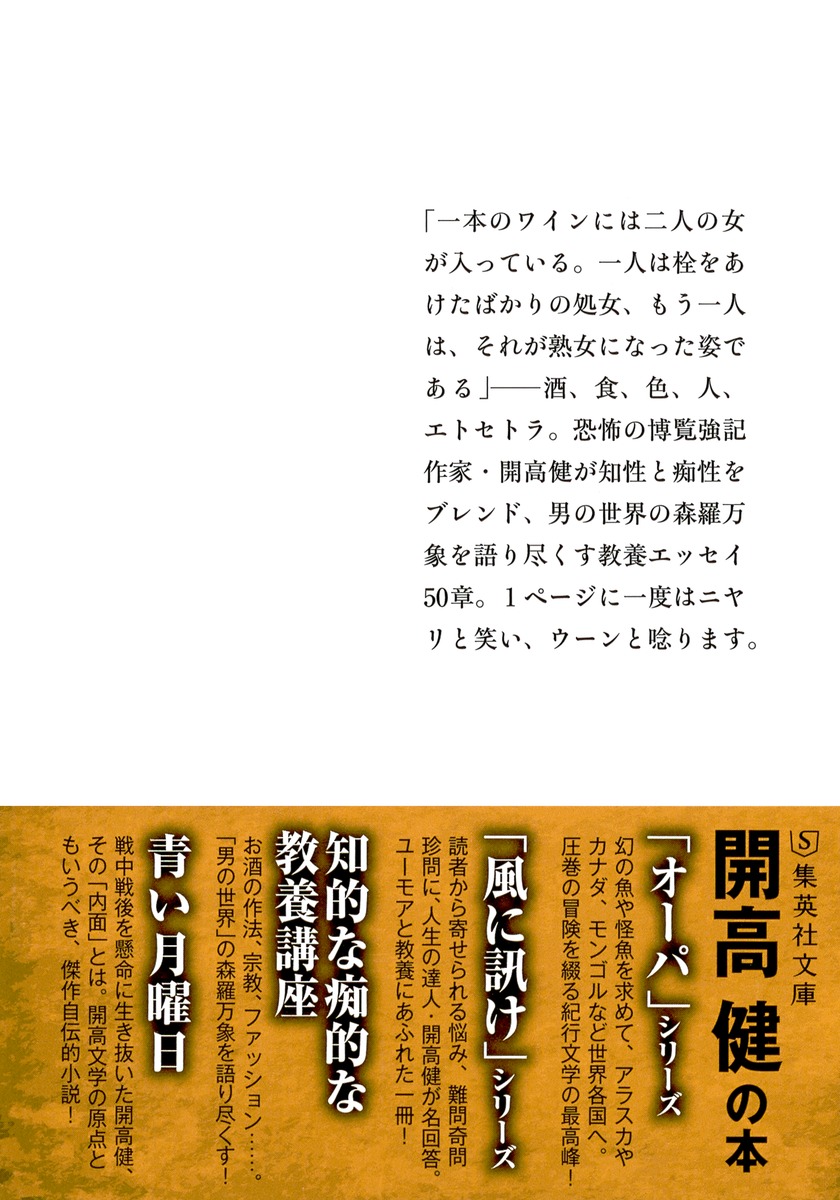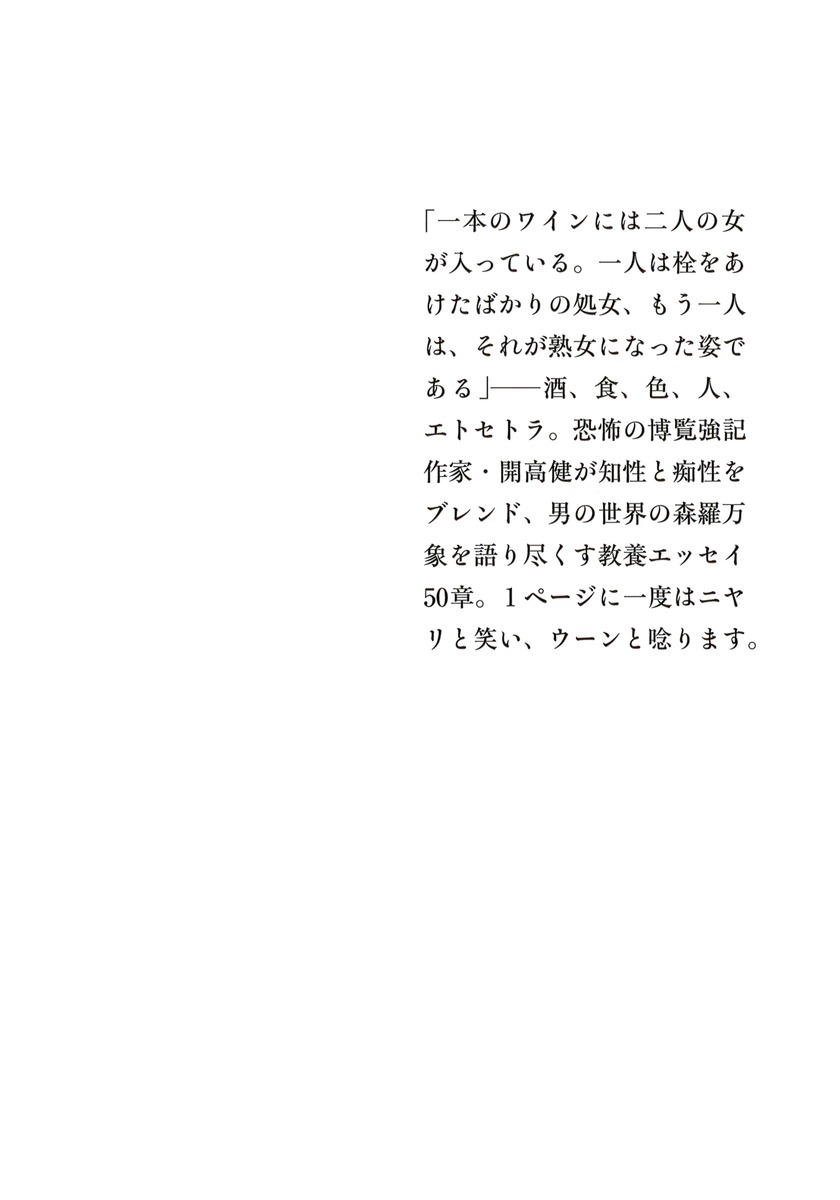 知性と痴性を見事にブレンド。お酒のTPO、宗教、哲学、ファッション、エトセトラ…。博覧強記の作家・開高健が男の世界の森羅万象を語り尽くした魅力あふれる教養エッセイ、芳醇な50章。