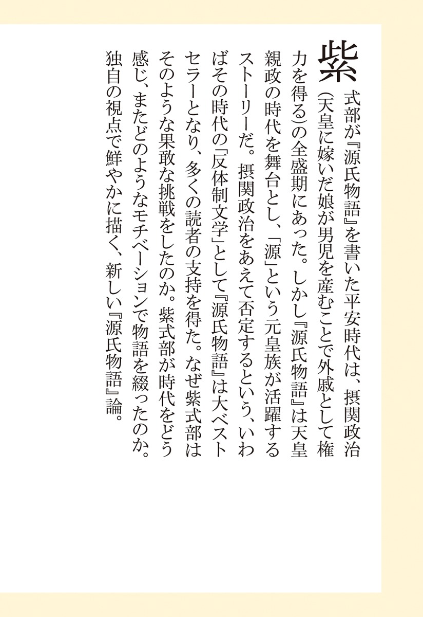 紫式部が『源氏物語』を書いた平安時代は、摂関政治(天皇に嫁いだ娘が男児を産むことで外戚として権力を得る)の全盛期にあった。しかし『源氏物語』は天皇親政の時代を舞台とし、「源」という元皇族が活躍するストーリーだ。摂関政治をあえて否定するという、いわばその時代の「反体制文学」として『源氏物語』は大ベストセラーとなり、多くの読者の支持を得た。なぜ紫式部はそのような果敢な挑戦をしたのか。紫式部が時代をどう感じ、またどのようなモチベーションで物語を綴ったのか。独自の視点で鮮やかに描く、新しい『源氏物語』論。