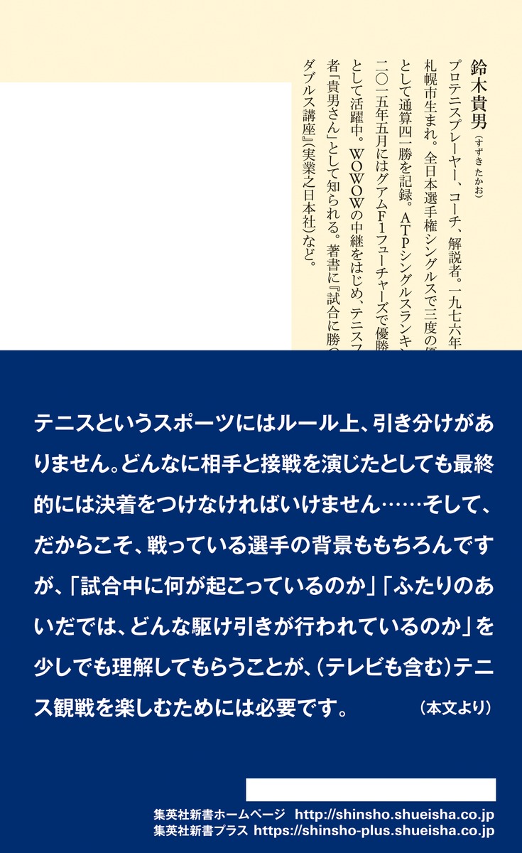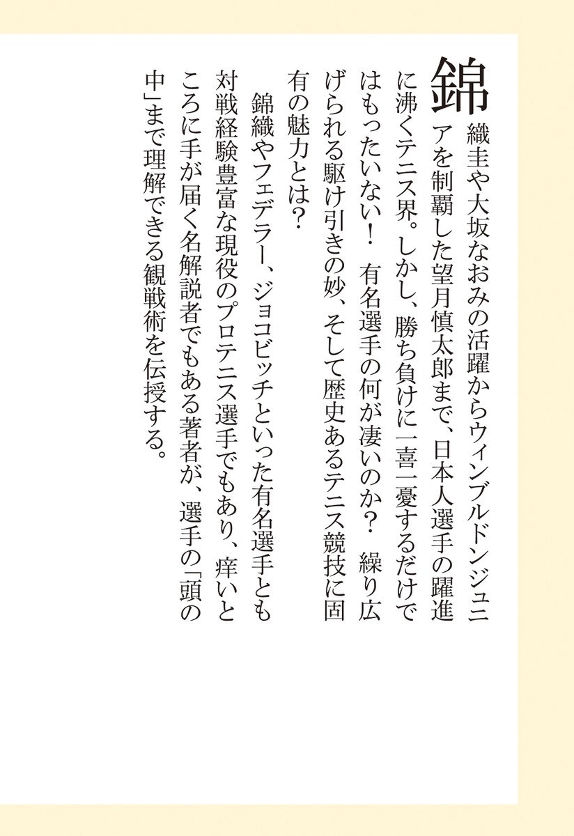 錦織やフェデラー、ジョコビッチといった有名選手とも対戦経験豊富な現役のプロテニス選手でもあり、痒いところに手が届く名解説者でもある著者が、選手の「頭の中」まで理解できる観戦術を伝授する。