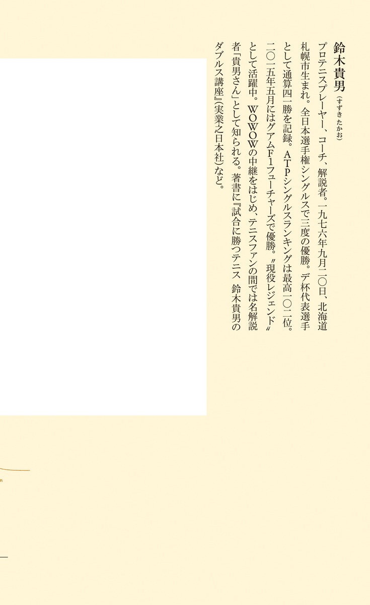 著書に『試合に勝つテニス 鈴木貴男のダブルス講座』(実業之日本社)など。