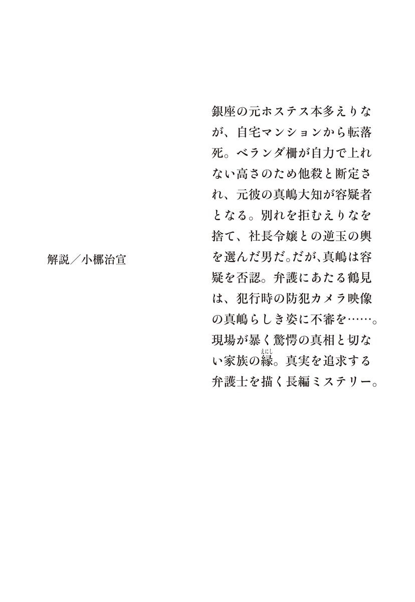 女が転落死し、元彼が容疑者に!?巧妙な事件の謎と縺れた家族の縁――驚愕の真実を暴く若き弁護士の活躍!銀座の元ホステス本多えりなが、自宅マンションから転落死。ベランダ柵が自力で上れない高さのため他殺と断定され、元彼の真嶋大知が容疑者となる。別れを拒むえりなを捨て、社長令嬢との逆玉の輿を選んだ男だ。だが、真嶋は容疑を否認。弁護にあたる鶴見は、犯行時の防犯カメラ映像の真嶋らしき姿に不審を……。現場が暴く驚愕の真相と切ない家族の縁(えにし)。真実を追求する弁護士を描く長編ミステリー。
