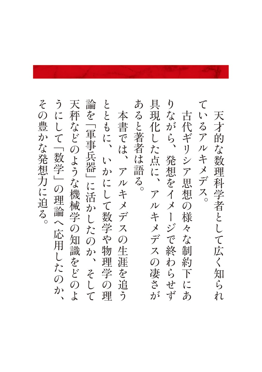 本書ではその生涯を追いながら、古代ギリシアにおけるさまざまな制約下で、発想を形として実現させたアルキメデスの凄さを再発見する。